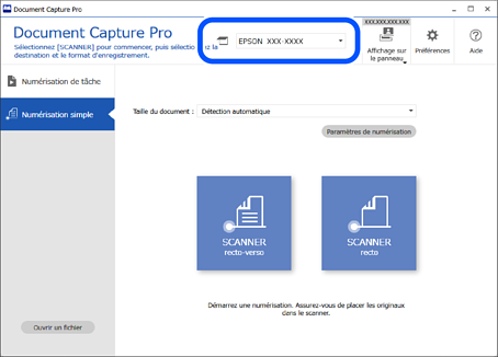 1Sélectionnez le scanner que vous souhaitez utiliser dans l’écran supérieur Document Capture Pro. Lorsque vous démarrez le logiciel, il se connecte automatiquement au dernier scanner utilisé.