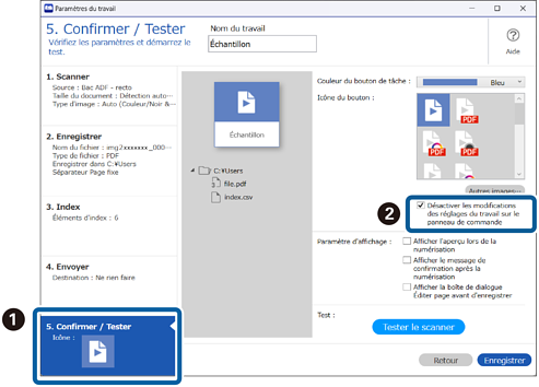 3Cliquez sur l’onglet 5. Confirmer / Tester, puis sélectionnez Désactiver les modifications des réglages du travail sur le panneau de commande.