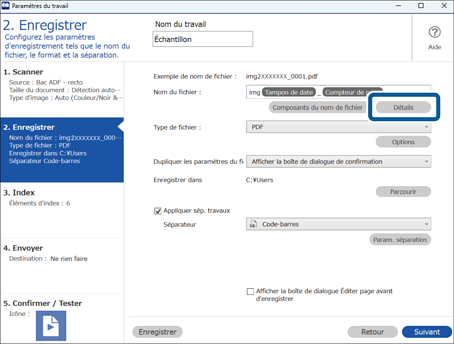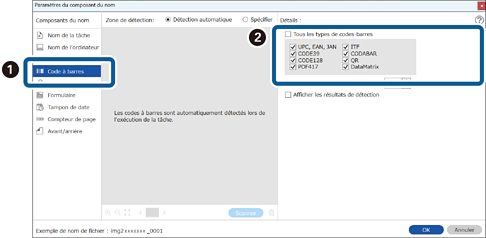 Pour sélectionner Code à barres dans Composants du nom de fichier, effectuez le réglage dans Détails et sélectionnez-le.