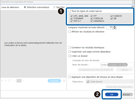 3Sur l’écran Paramètres de séparation de travaux, sélectionnez le type de code-barres que vous souhaitez utiliser (placé dans le document). Cliquez sur OK pour revenir à l’écran Paramètres de travaux.
