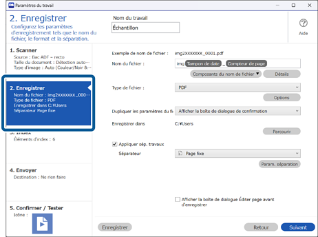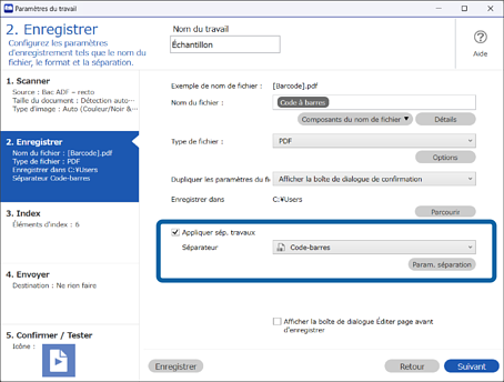 Si vous souhaitez afficher le code-barres/l’écran de reconnaissance OCR utilisé pour la séparation des travaux, rendez-vous à l’étape 7. Si vous n’avez pas besoin d’effectuer ce réglage, enregistrez le travail.