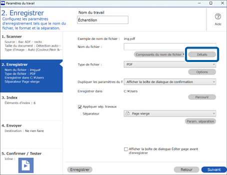 4Configurez les paramètres pour afficher le code-barres/l’écran de résultats de reconnaissance OCR utilisé pour les noms de fichiers Cliquez sur Détails.