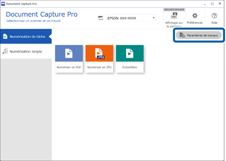 1Cliquez sur Paramètres de travaux sur l’écran supérieur Document Capture Pro.