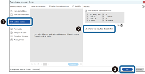 5À l’écran Paramètres du composant du nom, sélectionnez Code-barres ou OCR conformément au contenu du nom de fichier que vous souhaitez définir, sélectionnez Afficher les résultats de détection, puis cliquez sur OK.