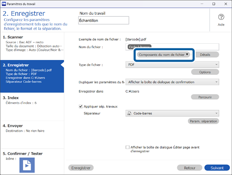 6Sélectionnez Code-barres ou OCR dans Composants du nom de fichier conformément au contenu du nom de fichier que vous souhaitez définir.