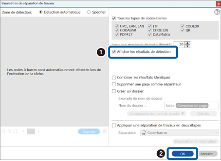 8Sélectionnez Afficher les résultats de détection sur l’écran Paramètres de séparation de travaux, puis cliquez sur OK.