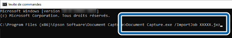 6Saisissez Document Capture.exe /ImportJob XXXXX.jxz (nom du fichier de travail), puis appuyez sur la clé Entrée pour l’exécuter.