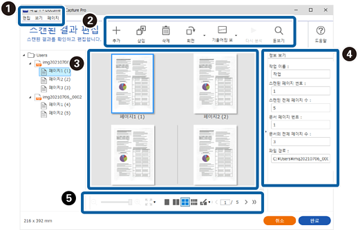 스캔한 이미지를 표시합니다. 썸네일을 끌어다 놓아 페이지를 재정렬할 수도 있습니다. |