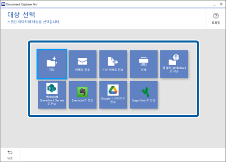1Document Capture Pro 최상위 화면에서 사용하려는 스캐너를 선택하십시오. 소프트웨어를 시작하면 마지막으로 사용한 스캐너에 자동으로 연결됩니다.