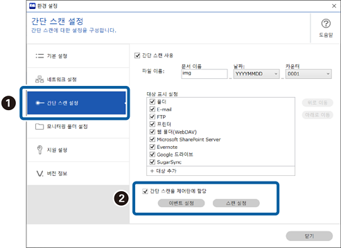 2간단 스캔 설정 탭을 클릭하고 간단 스캔을 제어판에 할당을 선택한 다음, 이벤트 설정을 클릭합니다.
