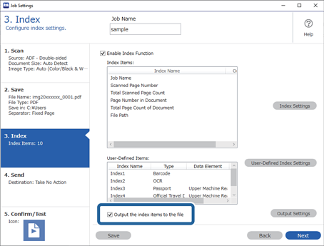 9Ställ in utdataobjekten och filnamnet som ska användas när indexobjekt sparas till en fil och klicka sedan på OK.