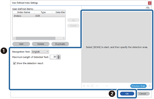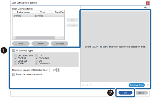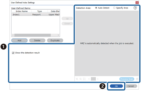 Du kan ställa in ett användardefinierat index att baseras på streckkoder, OCR eller MRZ i pass och resedokument och skriva ut som indexdata.