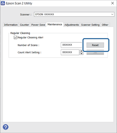 Efter rengøring af ADF (Regelmæssig rengøring) skal du nulstille scanningsantallet ved hjælp af Epson Scan 2 Utility.