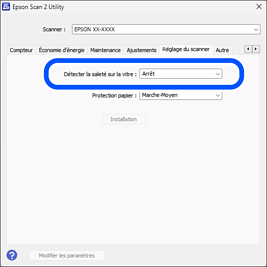 Si la fonction Détecter la saleté sur la vitre est réglée sur Marche, le scanner détecte toute traînée sur la surface vitrée à l’intérieur du scanner et affiche une notification sur l’écran de votre ordinateur.