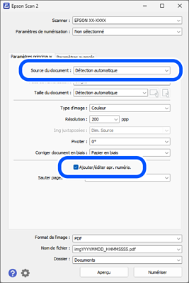 Sélectionnez Détection automatique depuis Source du document, puis sélectionnez Ajouter/éditer apr. numéris. avant de démarrer la numérisation.