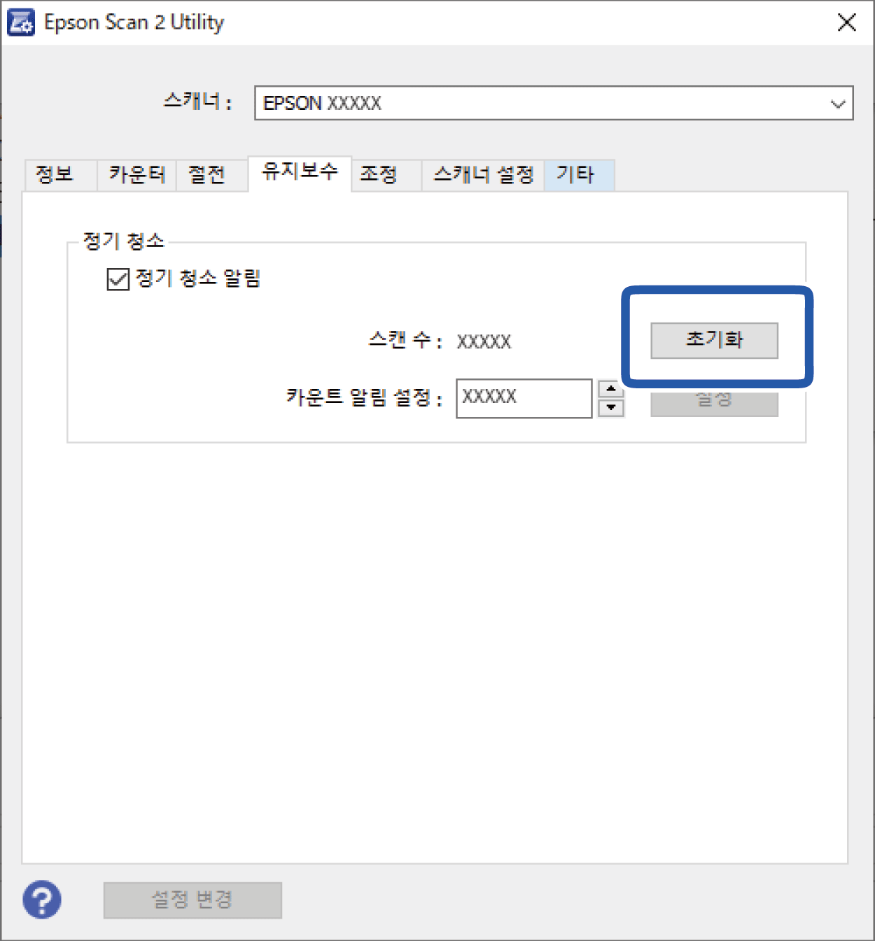 ADF (정기 청소)청소 후, Epson Scan 2 Utility를 사용하여 스캔 횟수를 재설정합니다.