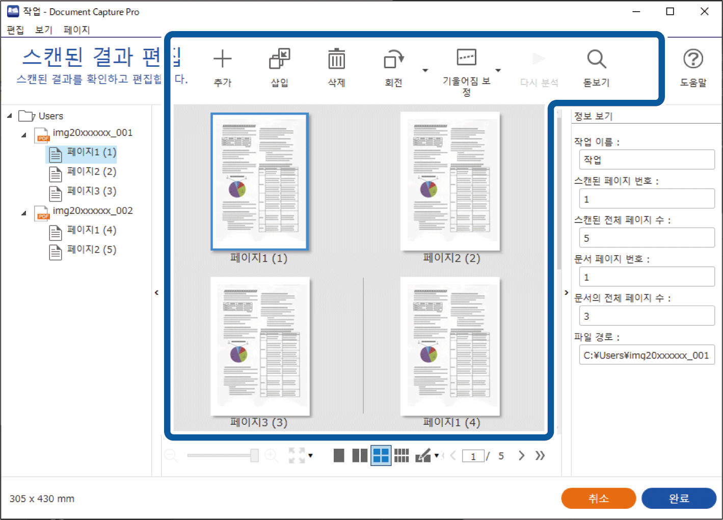 스캔 설정에서 저장 전 페이지 편집 대화상자 보기가 선택된 작업의 경우 스캔 후 스캔된 결과 편집 화면에서 스캔 결과를 확인한 다음 필요에 따라 편집하십시오.