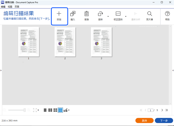 扫描完成后,会显示添加页面屏幕。放置下一张原稿并单击添加进行扫描。