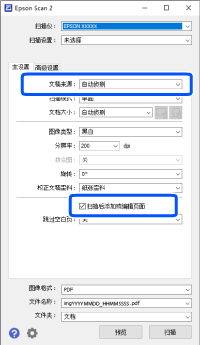 从文稿来源中选择自动侦测(自动检测),然后选择扫描后添加或编辑页面,然后开始扫描。