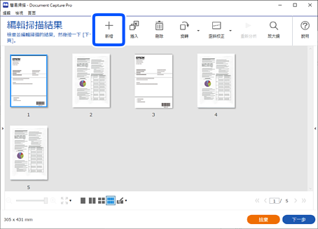 當掃描完成並且顯示 [編輯掃描結果] 畫面時,放置下一原稿並按一下 [+新增] 鍵。