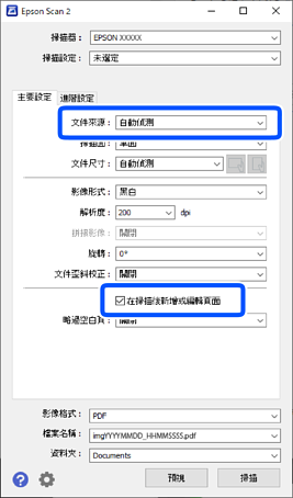 從 [文件來源] 選擇 [自動偵測],然後在開始掃描前選擇 [在掃描後新增或編輯頁面]。
