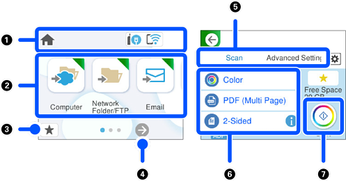 يشير إلى حالة الماسحة الضوئية كرموز. حدد الرمز للتحقق من الإعدادات الحالية أو للوصول إلى جميع قوائم الإعداد. |