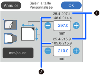 Le format de l’original que vous pouvez définir varie en fonction de la source du document utilisé pour placer l’original. Saisissez les valeurs en fonction des nombres affichés à l’écran.