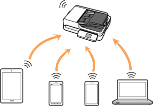 השתמש באפשרות הזו אם אינך משתמש ברשת Wi-Fi בבית או במשרד, או אם אתה רוצה לחבר ישירות בין הסורק לבין מחשב או מכשיר חכם. במצב הזה הסורק משמש כראוטר אלחוטי ואפשר לחבר אליו מכשירים בלי להשתמש בראוטר אלחוטי רגיל. עם זאת, התקנים המחוברים ישירות לסורק אינם יכולים לתקשר אלו עם אלו באמצעות הסורק.