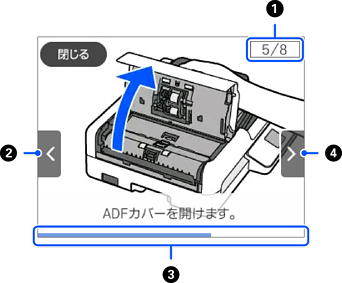 動画を構成する手順の総数と、現在表示している手順が何番目かを示します。 この画面の例では、全8手順中の5番目の手順を表示していることを示します。 |
