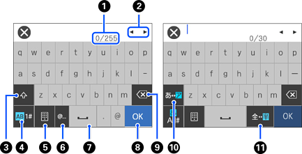 文字種を切り替えます。 あ:ローマ字入力 、かな文字入力 AB:アルファベット入力 1#:数字と記号入力 |