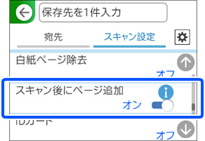 スキャン設定で[スキャン後にページ追加]を[オン]にしてスキャンします。