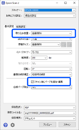 [取り込み装置]で[自動検知]を選択し、[スキャン後にページを追加・編集]にチェックを入れてスキャンします。