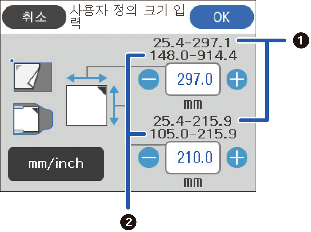 정의할 수 있는 원본 크기는 원본을 배치하는 데 사용된 문서 소스에 따라 달라집니다. 화면에 표시된 숫자에 따라 값을 입력하세요.