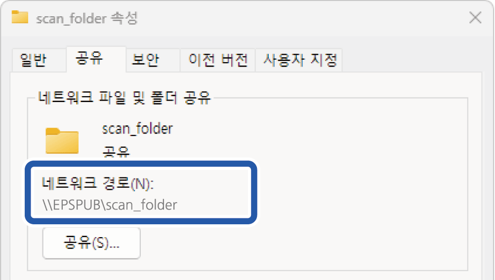 대상 네트워크 폴더의 경로를 유니코드(UTF-16)로 1~253자로 입력하세요. 경로 시작부분의 "\\"는 이미 입력되었습니다. 네트워크 폴더의 속성을 열고 공유 탭에 나타나는 네트워크 경로를 입력합니다. 예시: \\EPSPUB313\scan_folder ![]() |