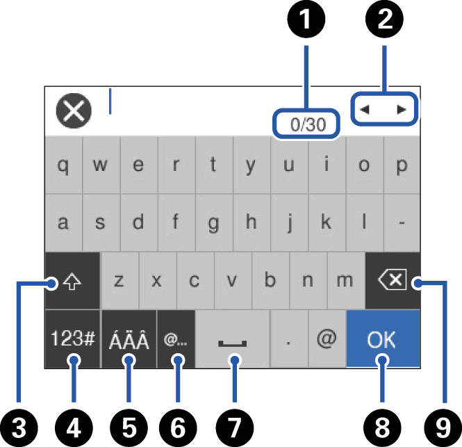 연락처 등록, 네트워크 설정 지정 등을 할 때 화상 키보드를 사용하여 문자와 기호를 입력할 수 있습니다.