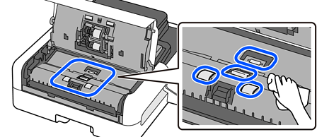 Lapkan sebarang kotoran dari penggulung atas (dua lokasi).