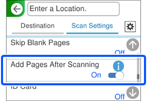 Apabila mengimbas daripada ADF dan kaca pengimbas dalam imbasan tunggal, selesaikan imbasan pertama, dan imbas dokumen tambahan daripada sumber dokumen lain.