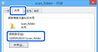 輸入 Unicode(UTF-16)格式且不超過 1 至 253 個字元的目的地網路資料夾路徑。 路徑開頭的「\\」已經輸入。 開啟網路資料夾的屬性,輸入顯示在[共用]索引標籤內的網路路徑。 範例:\\EPSPUB313\scan_folder ![]() |