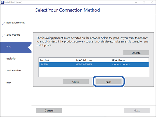 ปฏิบัติตามคำแนะนำบนหน้าจอจนกระทั่งหน้าจอต่อไปนี้แสดงผลขึ้นมา เลือกชื่อสแกนเนอร์ที่คุณต้องการเชื่อมต่อ จากนั้นคลิก ถัดไป