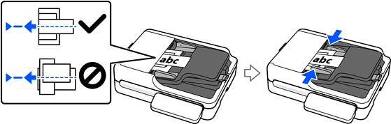 เมื่อโหลดต้นฉบับที่มีขนาดแตกต่างกันรวมกัน ให้ใส่ต้นฉบับโดยให้ด้านที่จะสแกนหันขึ้นและในลำดับขนาดกระดาษจากมากไปน้อยพร้อมกับขนาดที่กว้างที่สุดอยู่ด้านหลังสุดและขนาดที่แคบที่สุดอยู่ตรงกลางของถาดป้อนกระดาษ จากนั้น เลื่อนแนวจัดขอบเพื่อจัดแนวเข้ากับต้นฉบับที่กว้างที่สุด