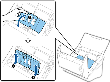 Push the hooks on both ends of the separation roller cover to open the cover.