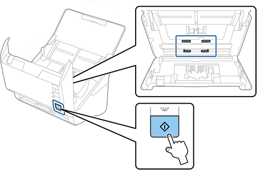 button for at least two seconds while opening the scanner cover. The rollers on the bottom move momentarily, and then the scanner enters cleaning mode. The rollers rotate a bit each time you press the