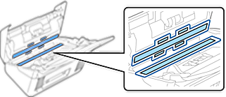 Wipe off any stains on the plastic roller and glass surface at the bottom inside of the scanner cover using a soft cloth or a genuine Epson cleaning kit.