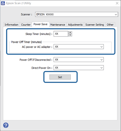 Set the Sleep Timer (minutes), Power Off Timer (minutes), or Power Off If Disconnected, and then click Set.