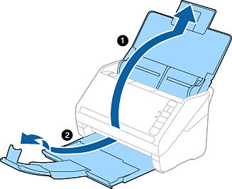 Open the input tray and extend the input tray extension. Slide out the output tray, extend the output tray extension, and then raise the stopper.