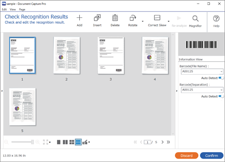 Se executar uma tarefa que contenha os seguintes elementos nas Definições do Nome de Ficheiro, Definições de Separação ou Definições de Índice Definidas pelo Utilizador em Definições de Guardar, e os elementos forem detetados na página digitalizada, a área de deteção será exibida na imagem como uma demarcação. Corrigir os resultados do reconhecimento manualmente, se necessário, ou altere a área e execute o reconhecimento novamente.