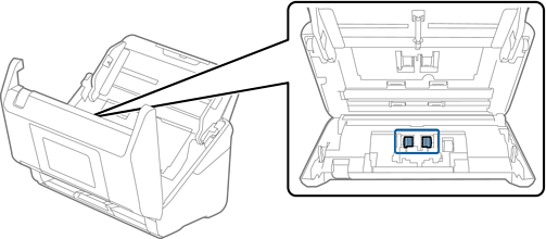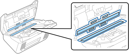 Depois de utilizar o scanner durante algum tempo, o papel e a poeira ambiente no rolo ou na parte de vidro no interior do scanner podem causar problemas na alimentação do papel e na qualidade de imagem. Limpar o interior do scanner a cada 5,000 digitalizações.