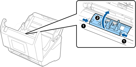 Potisnite kavlje na obeh koncih pokrova ločevalnega valja, da odprete pokrov.