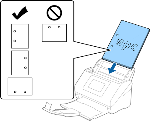 Pri optičnem branju izvirnikov z luknjami, kot so nevezani listi, naložite izvirnik tako, da so luknje obrnjene proti strani ali navzdol. Na sredini izvirnikov ne sme biti nobenih lukenj na 30 mm (1,2 palca) pasu. Vendar pa so luknje lahko znotraj 30 mm (1,2 palca) pasa od vodilnega roba izvirnikov. Robovi lukenj ne smejo biti prepognjeni ali zviti.