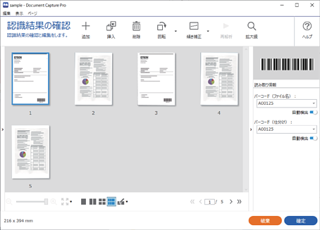 保存設定のファイル名設定や仕分け機能、ユーザー定義インデックスに以下の要素が入っているジョブを実行し、スキャンしたページ内にその要素が含まれているときは、画像上にマーキーで検出領域が表示されます。必要に応じて、認識結果を手動で修正したり、領域を変更したりして再度認識します。